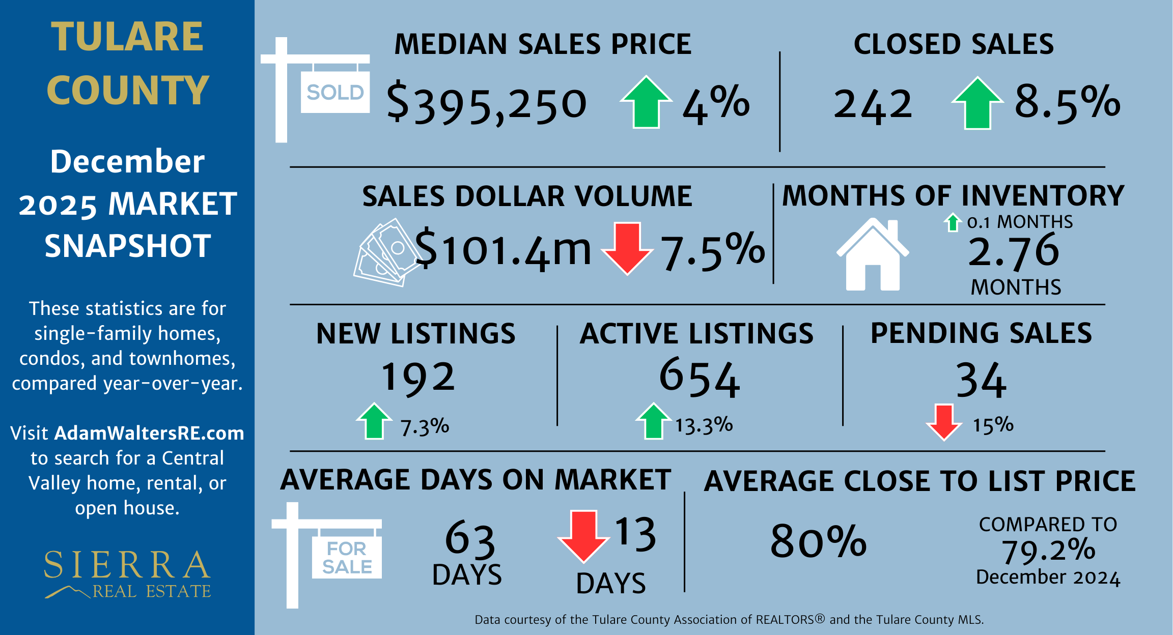 Tulare County closed 2025 with rising prices, increased sales activity, faster market times, and manageable inventory growth. While total sales volume softened due to fewer luxury transactions, the core housing market remains healthy and active.
